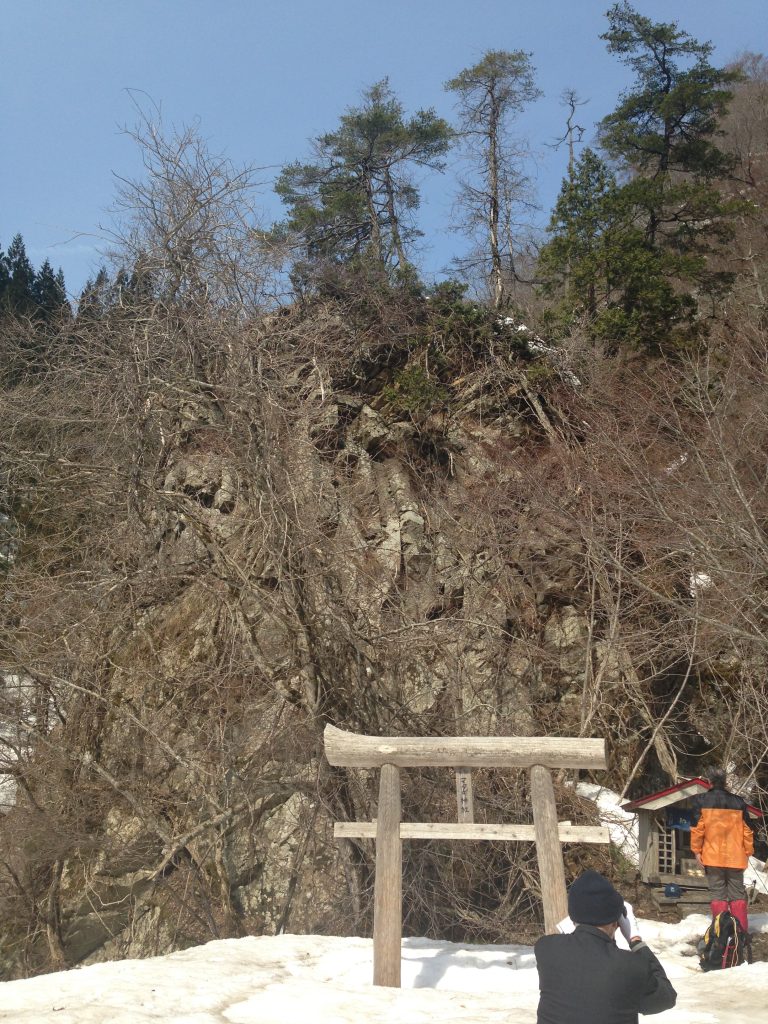 山の中に佇む小さな社。人里からも離れており、釣り人やマタギの人が時折訪れるのみです。後ろにある大きな岩盤がご神体であるとされています。